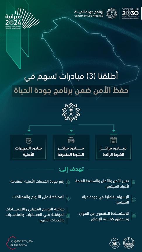 وأطلقت وزارة الداخلية ممثلة في الأمن العام خلال عام 2023م، (3) مبادرات جديدة هي (التجهيزات الأمنية، مراكز الشرط الرائدة، مبادرة مراكز الشرط المتحركة)، بهدف تعزيز الأمن والسلامة العامة للمجتمع، ورفع جودة الخدمات الأمنية، وتحسين جودة الحياة للمواطن والمقيم والزائر.